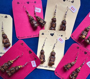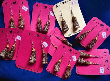 We also strive to be as eco-friendly and sustainable as possible, again as a hope to inspire other businesses to be more considerate of their choices and how they can better the environment and community. Our clothing is up-cycled vintage in a fight against fast fashion and garment waste, and majority of our jewelry is made from biodegradable bioplastics made from algae, as a resin substitute because of resins inability to compost. Even screen-printing on recycled Bristol paper, as a subtle hope to make the small changes which can create big impact.